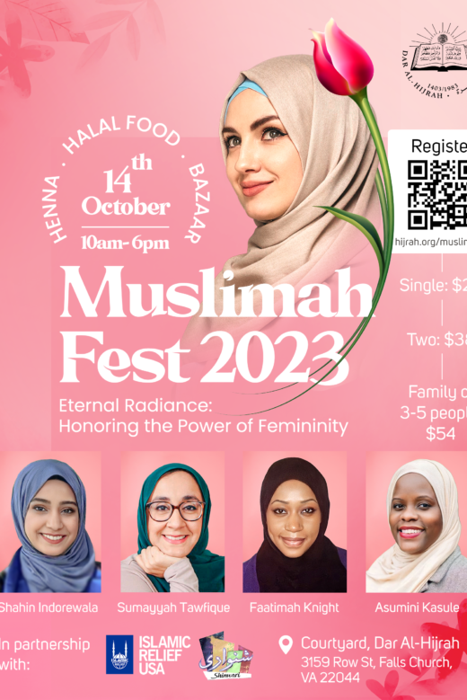 Muslimah Fest is an annual conference and bazaar for the women of Dar al-Hijrah and the greater community. Goals include women's empowerment, spiritual upliftment, community building, and social networking. This year's THEME is: Eternal Radiance: Honoring the Power of Femininity