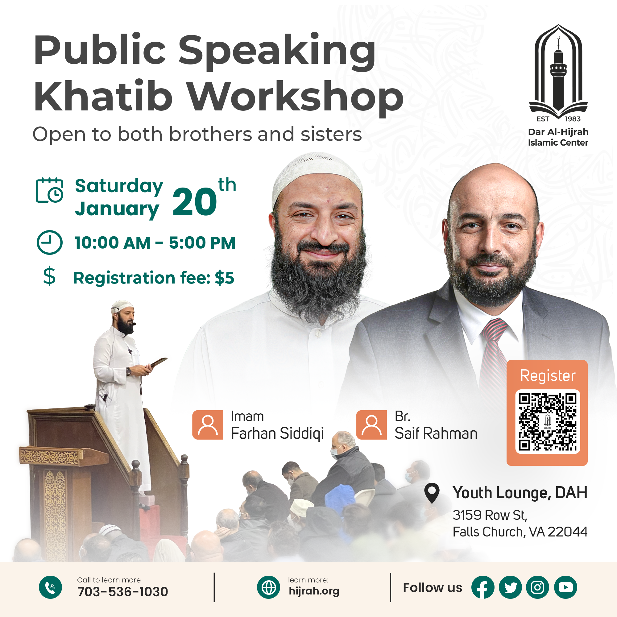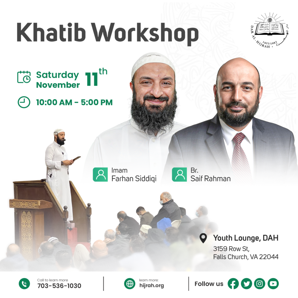 Dar Al-Hijrah Youth Lounge 3159 Row St. , Falls Church , United StatesOpen to both brothers and sisters Imam Frhan Siddiqi & Br. Saif Rahman Registration fee: $5