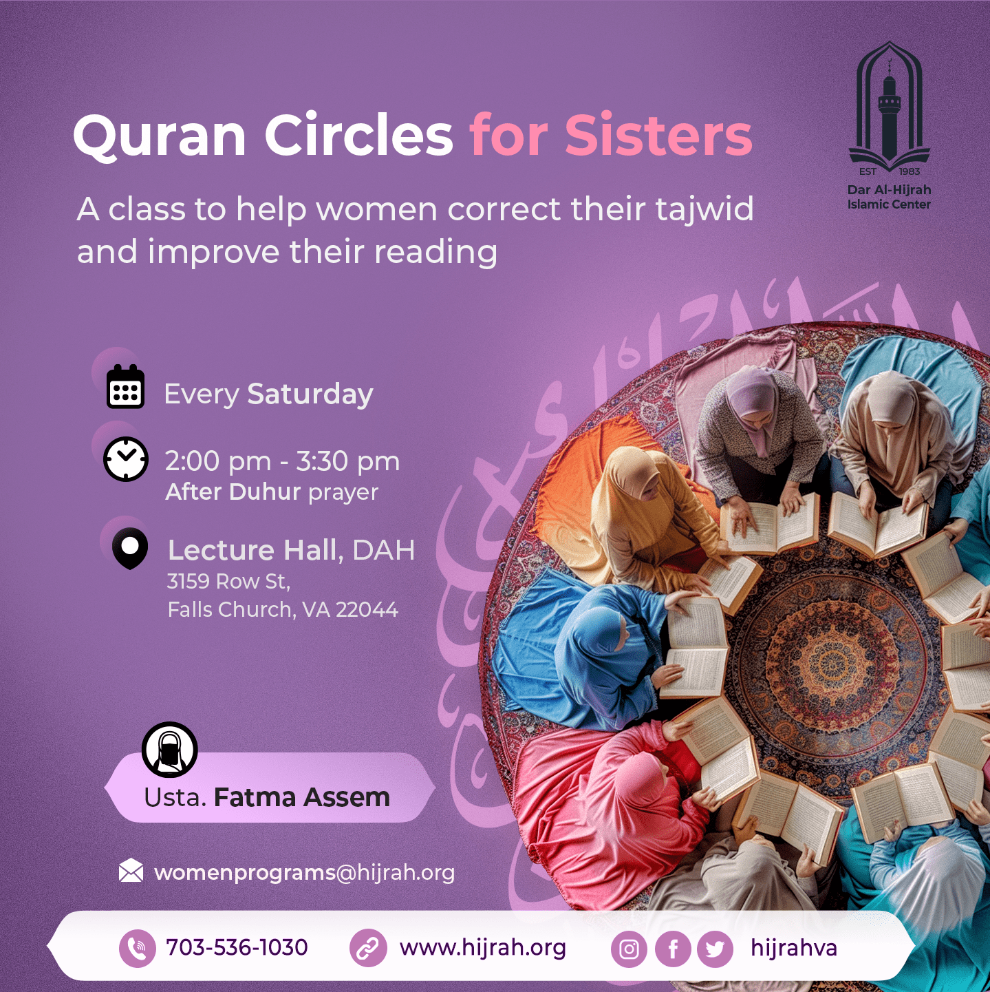 Ustada Fatma Assem - A class to help women correct their tajwid and improve their reading - Every Saturday @ 2pm - 3:30pm (After Dhuhr prayer)