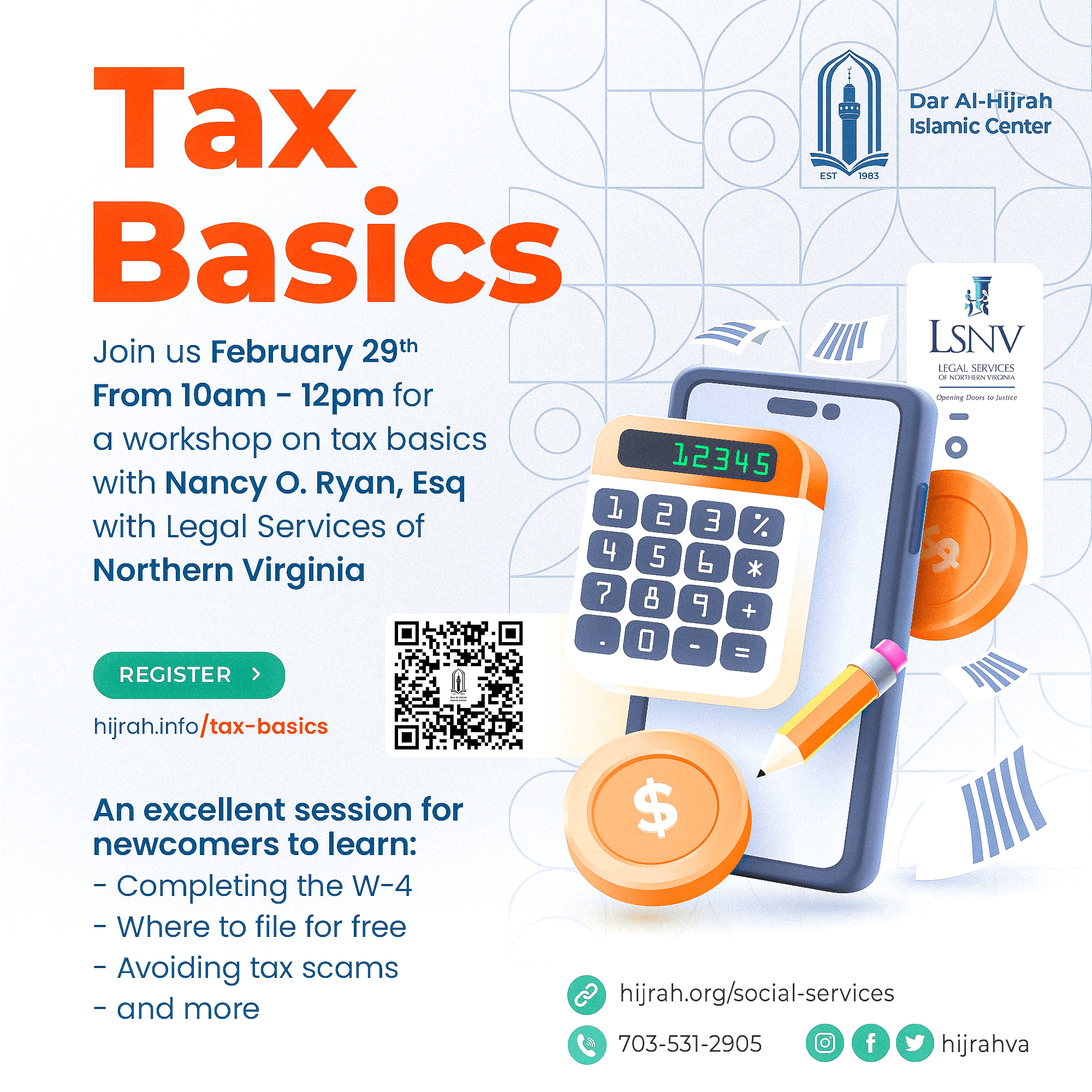 Join us February 29th @10am-12pm for a workshop on tax basics with Nancy O. Ryan, Esq with Legal Services of Nothern Virginia - Register @ hijrah.info/tax-basics - An excellent session for newcomers to learn: Completing the W-4, Where to file for free, Avoiding tax scams, and more.