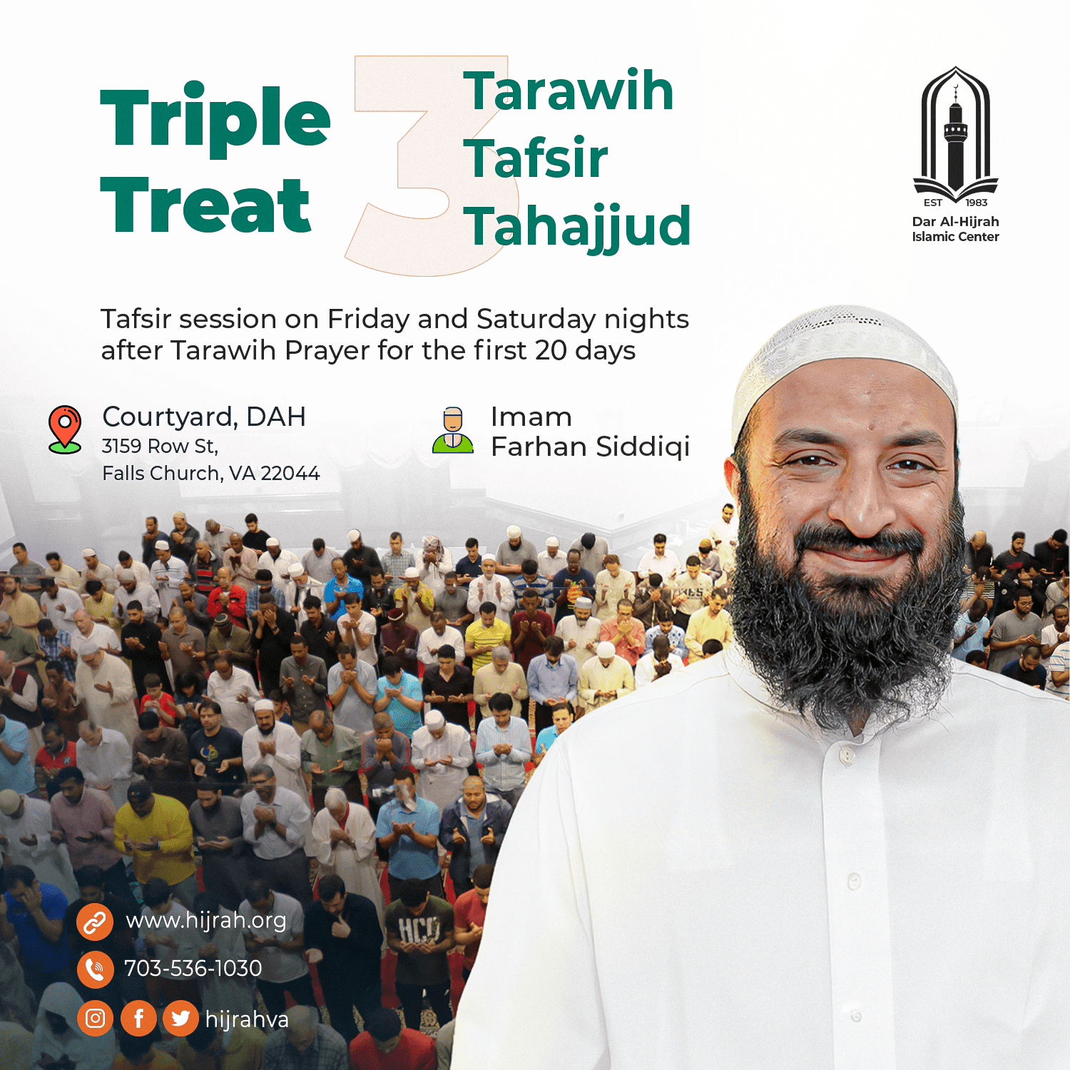 Dar Al-Hijrah 3159 Row St. , Falls Church, United StatesTarawih Tafsir Tahajjud - Imam Farhan Siddiqi - Tafsir session on Friday and saturday nights after Tarawih Prayer for the first 20 days